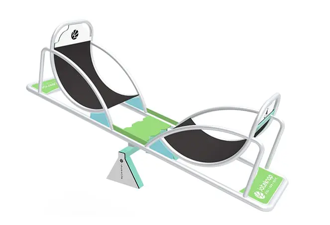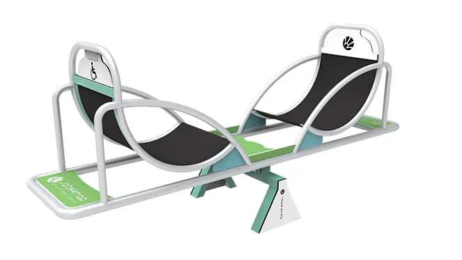 Det er også derfor, vi har designet en særlig bred, 640 mm, buet siddeflade, samtidig med at vi har en lav faldhøjde, så den muligvis ukendte, bølgende bevægelsesform kan være en absolut positiv spiloplevelse. Sædet med en buet liggeflade giver stabil støtte til ryggen, også for dem, der har svært ved at holde overkroppen. Bredden på de opretstående dele er 205 mm, hvilket giver fuld støtte til sålen. Til at støtte benene på siddende børn anvendes et bredt HDPE-element i den midterste del af enheden. Buede håndlister giver et stabilt greb til alle swingere.