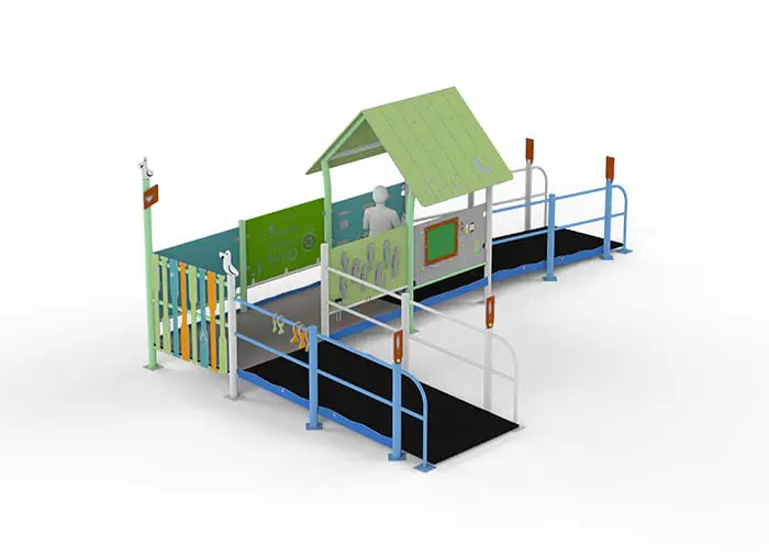 Vores produkt er en kompleks, barrierefri enhed med to ramper, hvorpå vi forsøgte at skabe en sjov krog med forskellige opgaver og pædagogiske paneler, primært til børn i kørestol. Dette kørestolsvenlige legeredskab fremmer også social interaktion, i inklusionens ånd, fælles leg for alle børn. Der er adgang for kørestolsbrugere i hele tårnets længde.