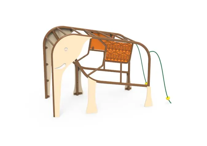 Legetøjet har følgende design: elefantens krop er givet af stiliserede, pulverlakerede kurver – kroppens fyldeelementer: formen på hovedet og fødderne og elefantens sadel er givet af HDPE-elementer. Elefantens hale er et fast rebelement.