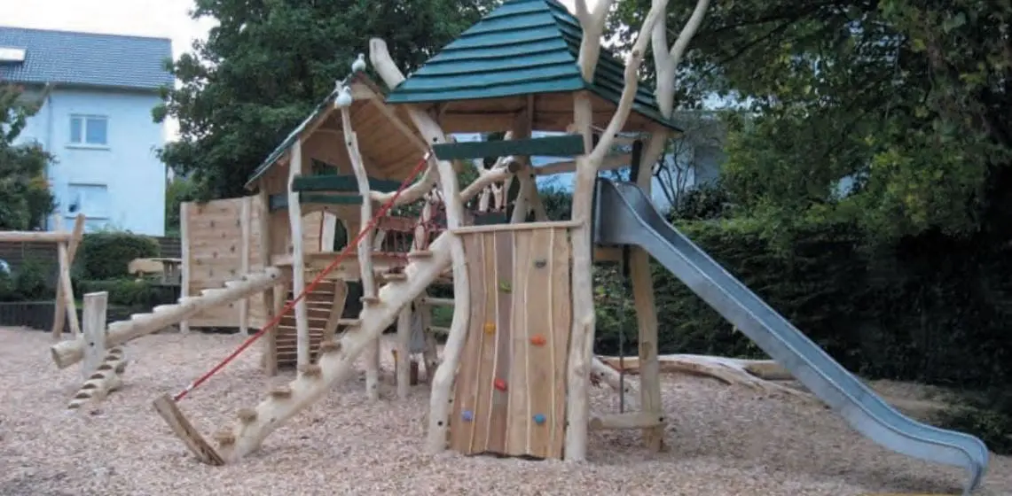 Legetårn med 4 platforme, klatrerampe med greb og reb, klatrerampe med reb, klatrenet, balancestamme, 2 stolper med trinhak, stolpe med trin, klatrevæg med greb, rutsjebane, gangbro og brandmandsstang