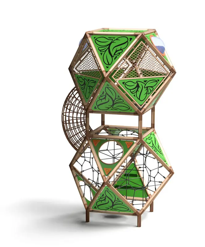 SFERO FOREST 2-1 består af to sammenkoblede sfæriske moduler i et natur-inspireret design. Det dobbelte kuglesystem giver børnene mulighed for at kravle fra den ene zone til den anden via tunneler. Konstruktionen er ekstremt slidstærk (varmgalvaniseret stål) men fremstår organisk grundet farvevalget i beige og brun. Indeholder klatrenet, udsigtsposter og balancereb. Farvetema: Beige/Brun/Grøn (Forest).