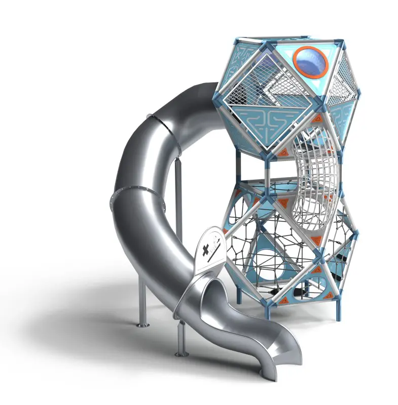 SFERO SPACE 2-2 er et fremragende blikfang bestående af to sammenkoblede sfæriske moduler og en lang kurvet rør-rutsjebane. Det inviterer til udforskning gennem klatring og rutsjning. Strukturen udvikler koordination og styrke. Indeholder blandt andet: 2 kugler, 1 kurvet rutsjebane, tunnel-forbindelse, klatrenet og gummi-hvileplatforme. Kapacitet til ca. 19 brugere. Farvetema: Grå/Blå (Space).