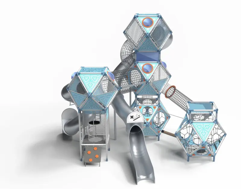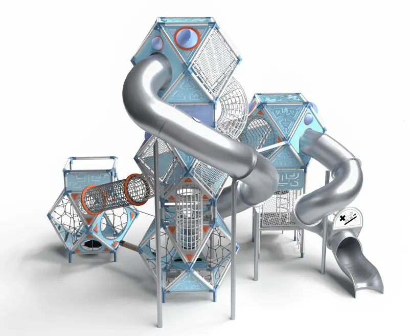 SFERO SPACE 5-1 er seriens flagskib – et gigantisk anlæg med fem forbundne kugler og to lange rutsjebaner. Det fungerer som et arkitektonisk vartegn. Med plads til op til 71 børn tilbyder det uendelige legemuligheder: ståltunneler, rebtunneler, stiger, balancereb og komplekse net-strukturer. Det ultimative valg til store parker eller skolegårde. Farvetema: Grå/Blå (Space).