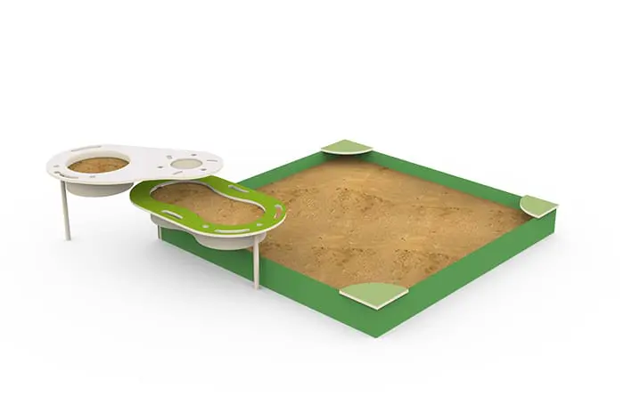 Sandbox legeenheden består af tre legepladser designet i en sådan højde, at de to stativdele er tilgængelige og bekvemt tilgængelige for kørestole, det knæfrie design sikrer også dette. Vi forsøgte at smugle en løsning ind i den klassiske sandkassefunktion, der sikrer lige chancer for succes og selvforkælende sjov i handicappede og raske børns fælles leg. Sigten placeret i det højeste eksterne modul kan bruges til at sigte sandet ind i sandbeholderne placeret på det nederste niveau, for at filtrere grus og andre skatte fra. De bølgede linjer i de farverige, legende HDPE-plastmoduler og deres bredere bænkarme er også velegnede til at hvile armene og muliggør også den behagelige formning af sandkager og figurer på bordpladerne.