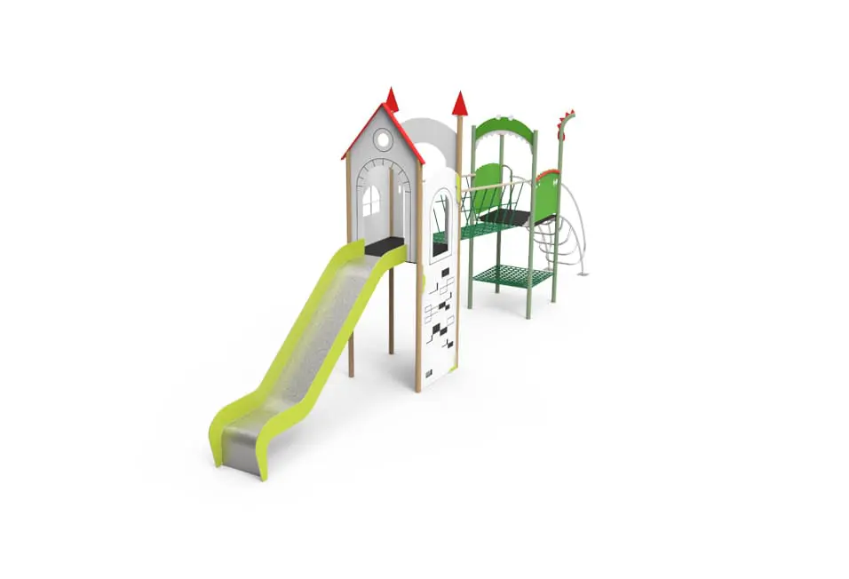 Et klassisk legeplads kombineret tårn, som dog med sin usædvanlige form og legende, farverige og kreative tilbehør virkelig kan blive et nyt højdepunkt på legepladsen. Baseret på faldhøjde og dimensioner anbefales produktet primært til mere muskuløse og modige børn i skoler og offentlige legepladser.