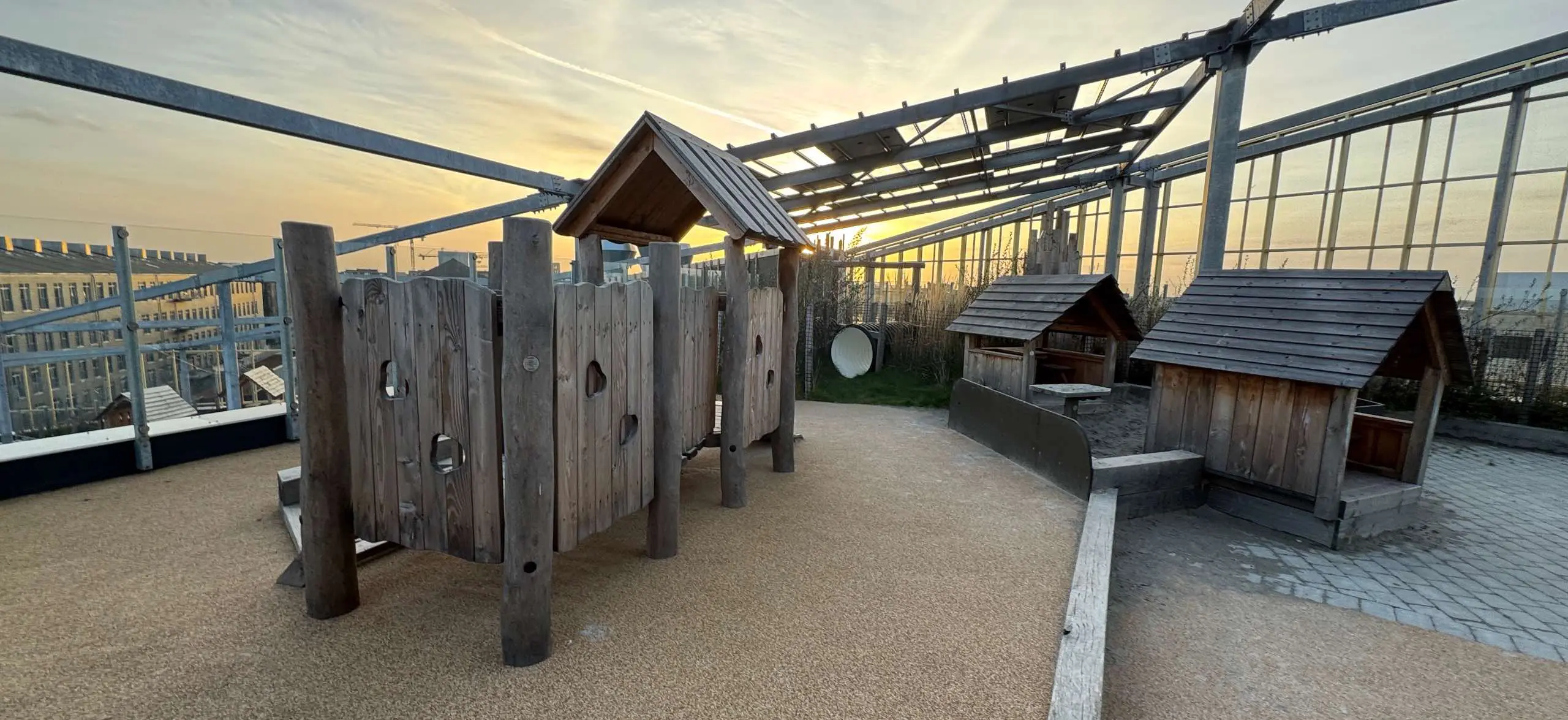 Overalt på de tre niveauer er områderne opdelt med forskellige belægninger, kraftige bjælker og områder med stærke græsarter og planter, der kan tåle det hårde miljø. Belægningerne veksler mellem fliser, faldunderlag (naturkork), kunstgræs og helt almindelig naturgræs. Flere steder er der blevet plads til borde/bænke, så her også er gode muligheder for ophold og rolige stunder. Områderne er indhegnet, så kun voksne kan bevæge sig imellem de tre niveauer, og det hele er delvis beskyttet af glaspaneler, der reducerer udfordringer med vind.